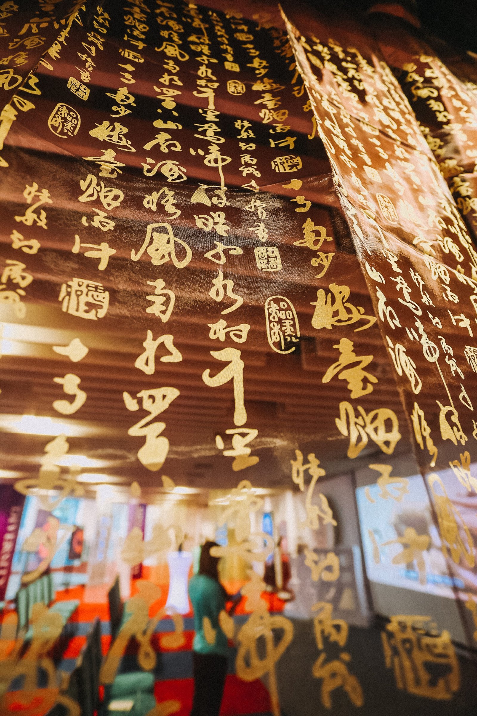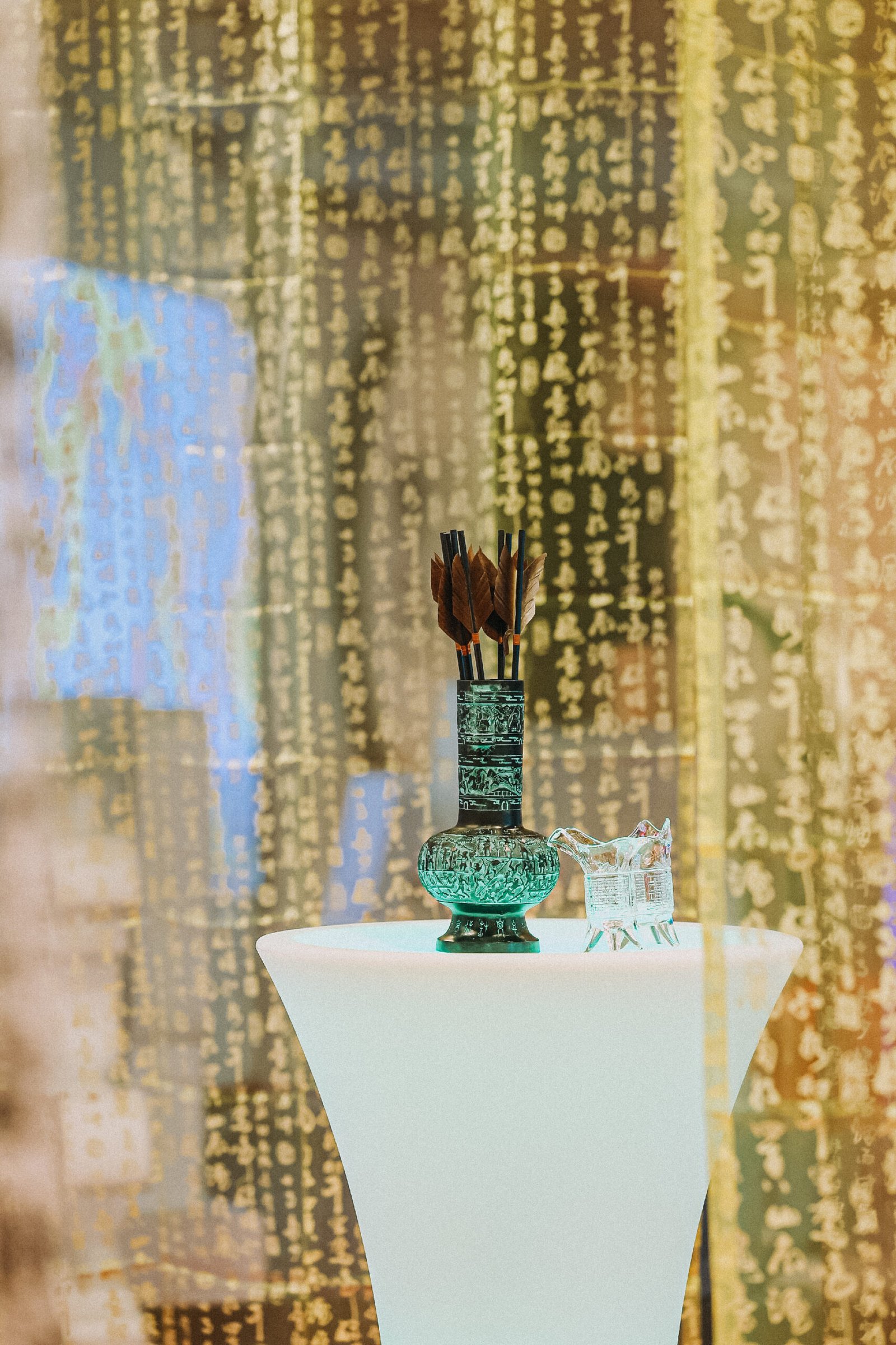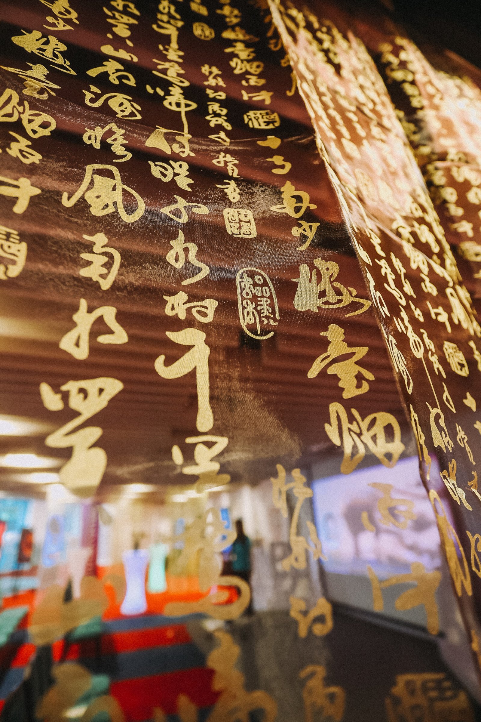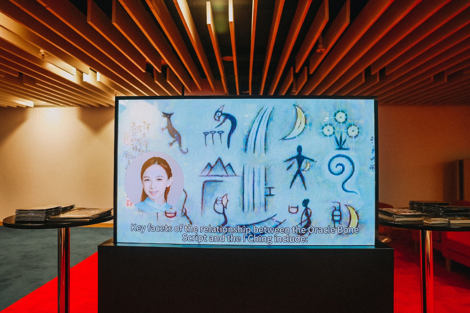 行雲流水的書法筆觸編織出靈性的故事,通過墨紙飛揚,與龜甲和龍骨上的古文字以及現代創新藝術完美融合。