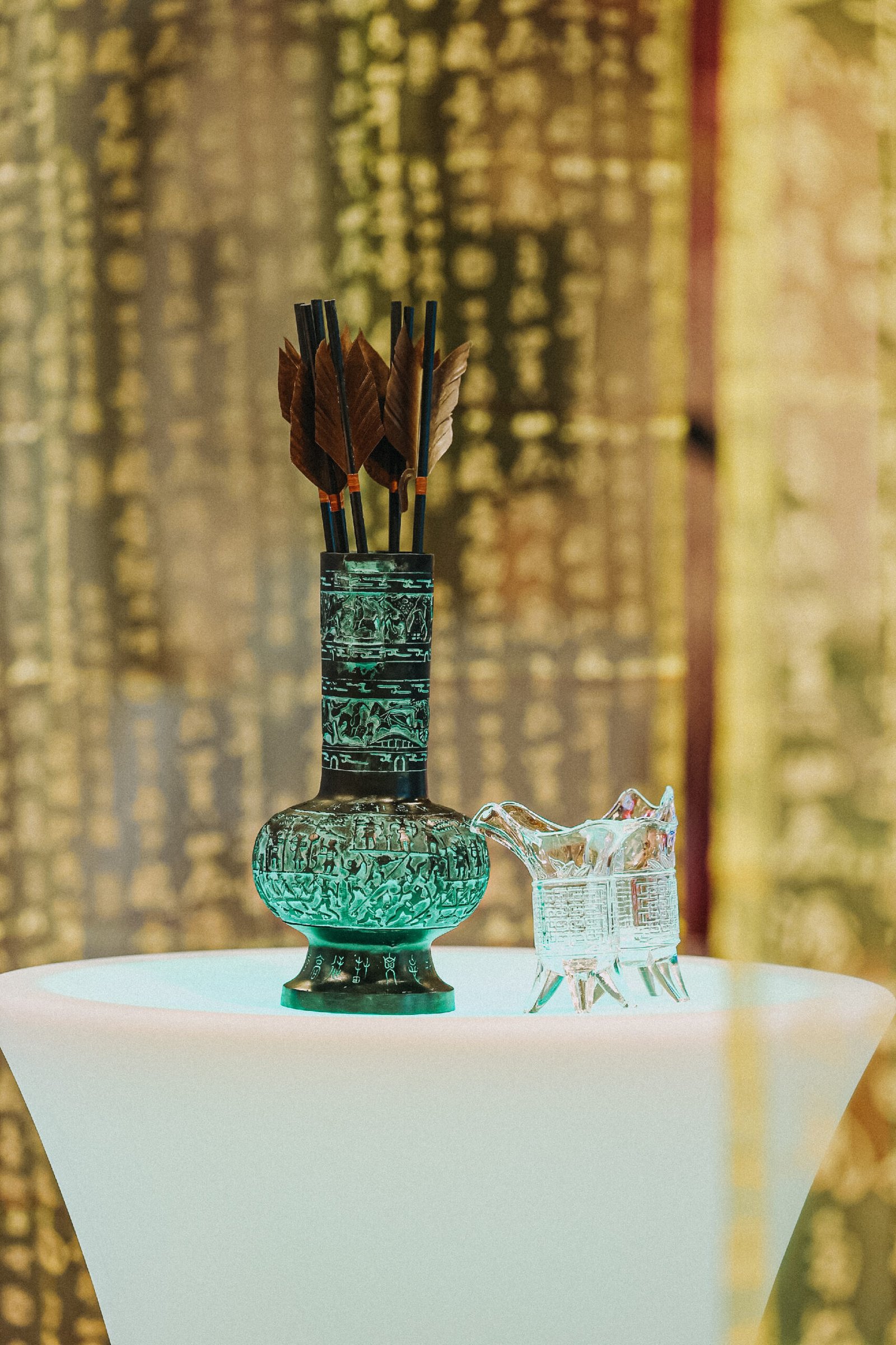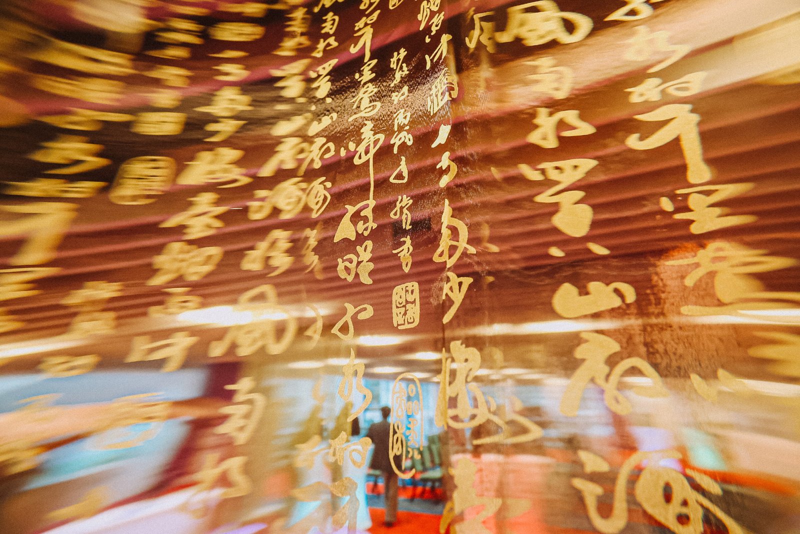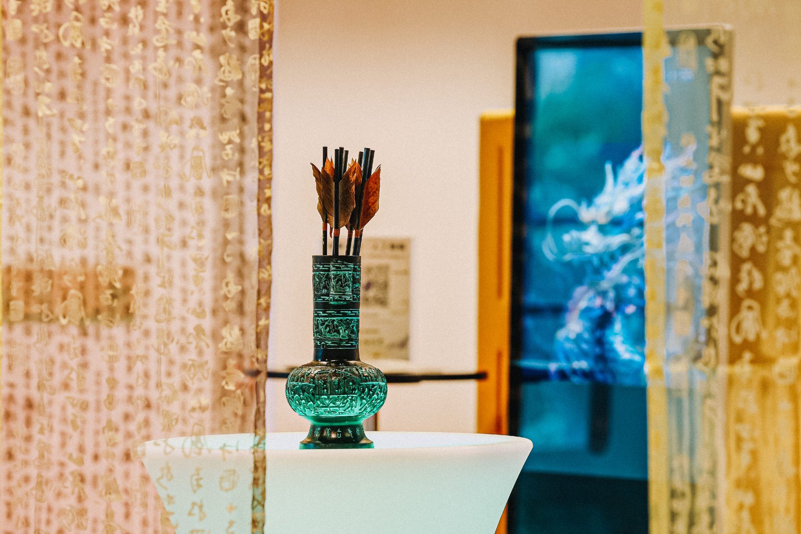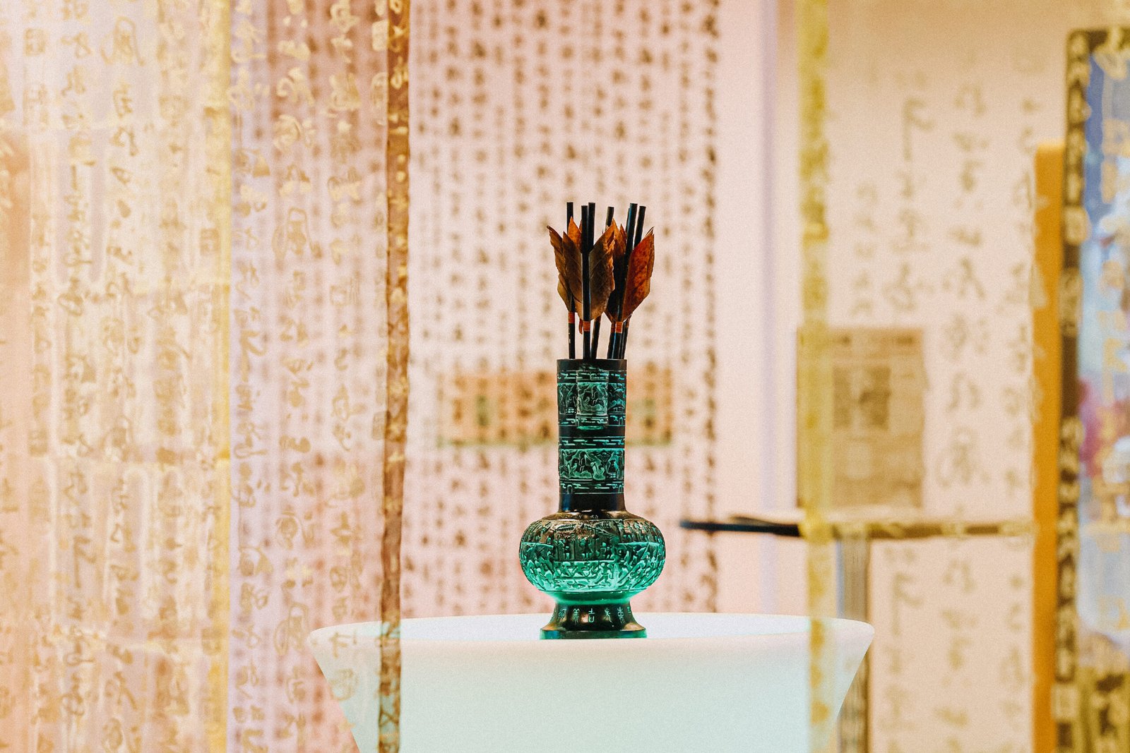 行雲流水的書法筆觸編織出靈性的故事,通過墨紙飛揚,與龜甲和龍骨上的古文字以及現代創新藝術完美融合。