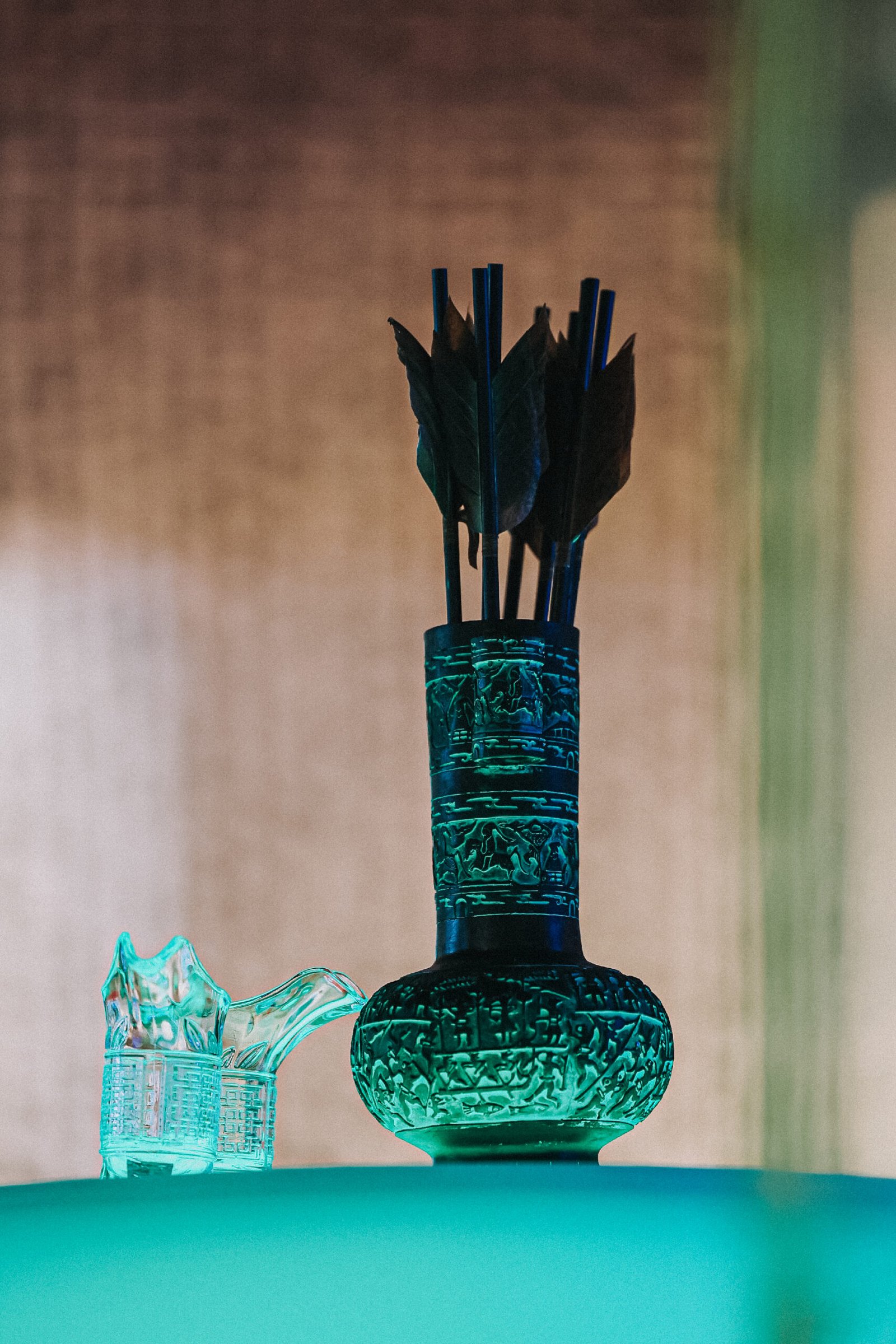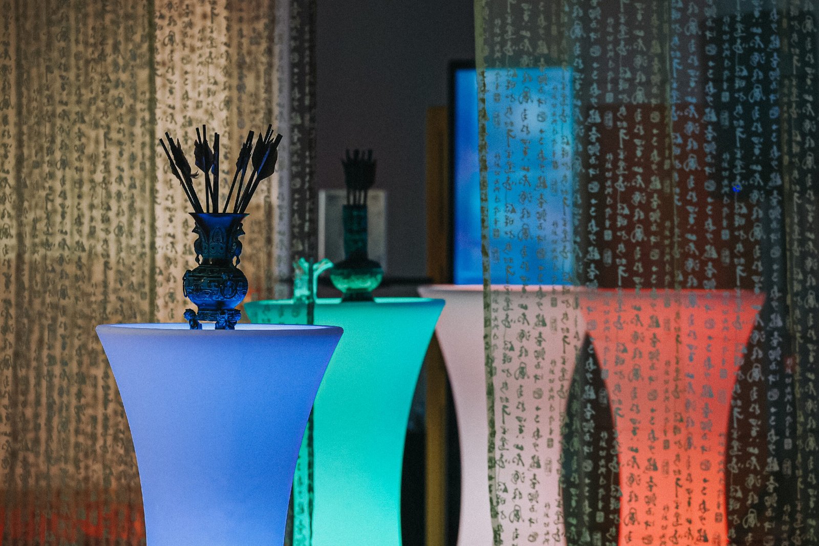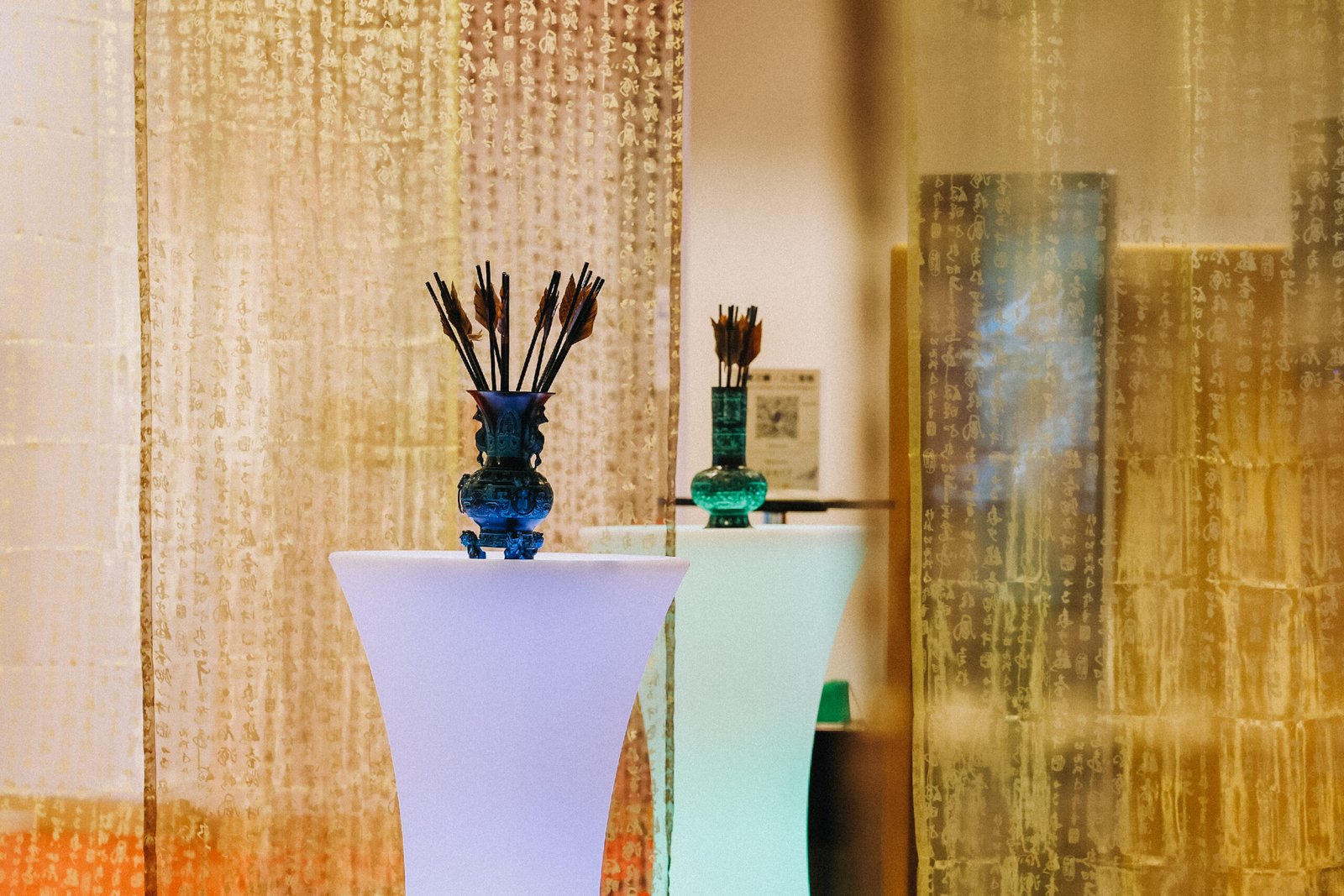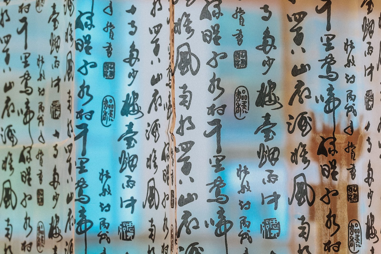 行雲流水的書法筆觸編織出靈性的故事,通過墨紙飛揚,與龜甲和龍骨上的古文字以及現代創新藝術完美融合。